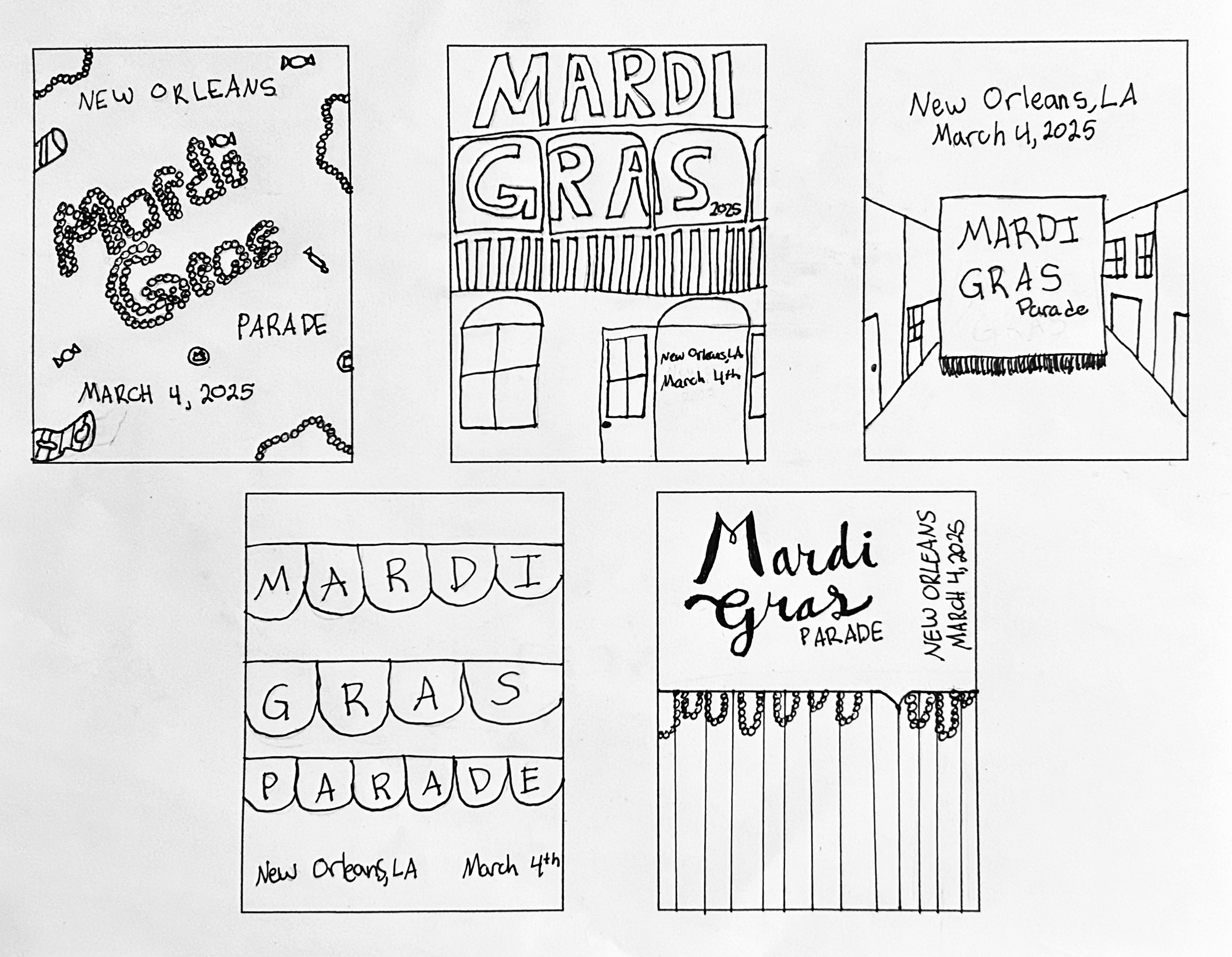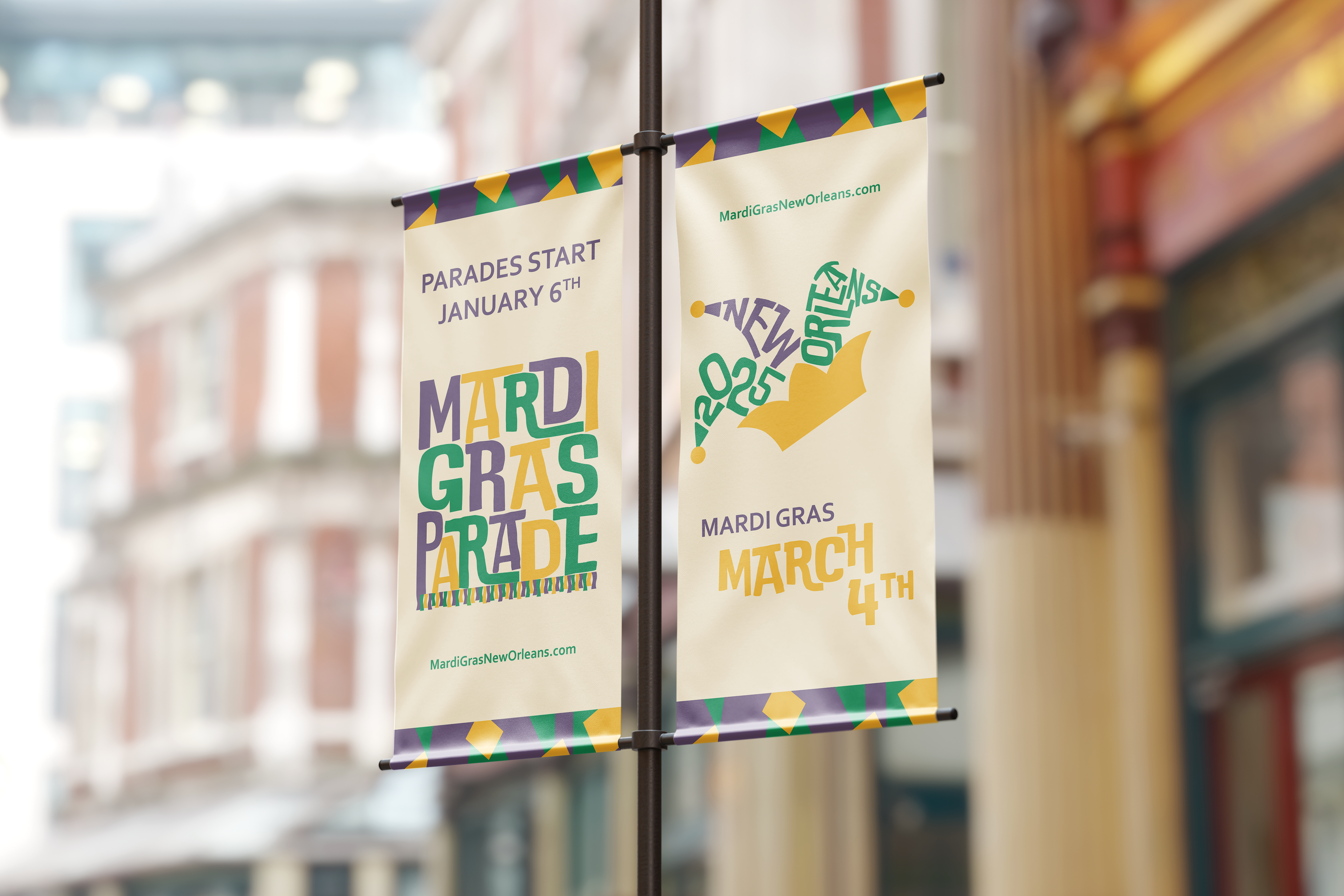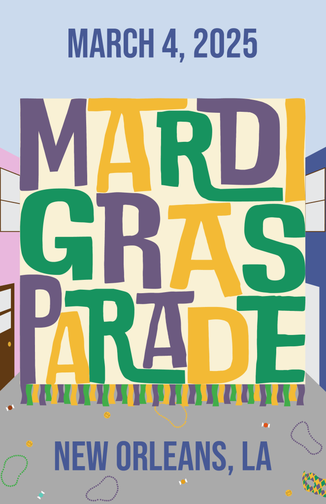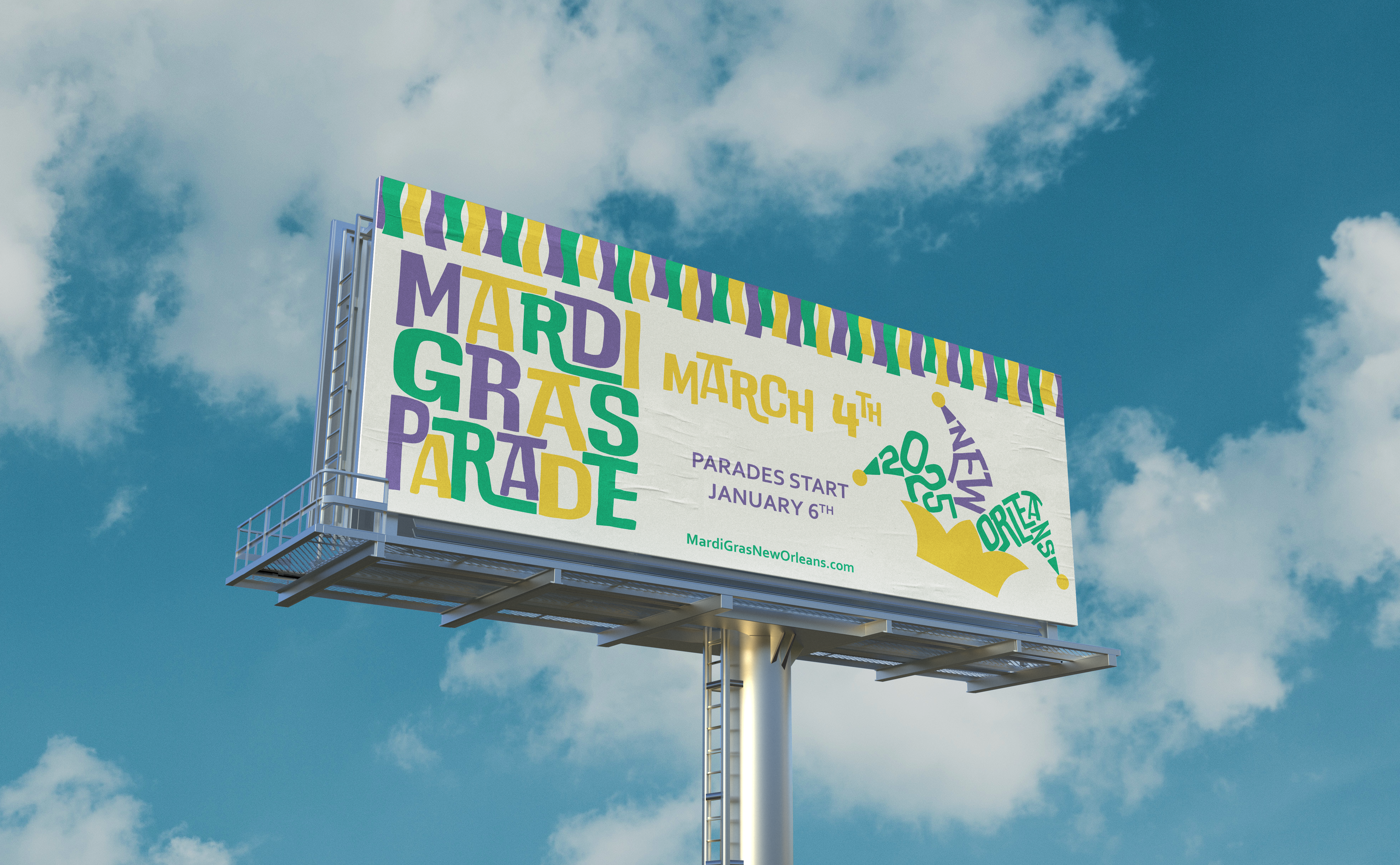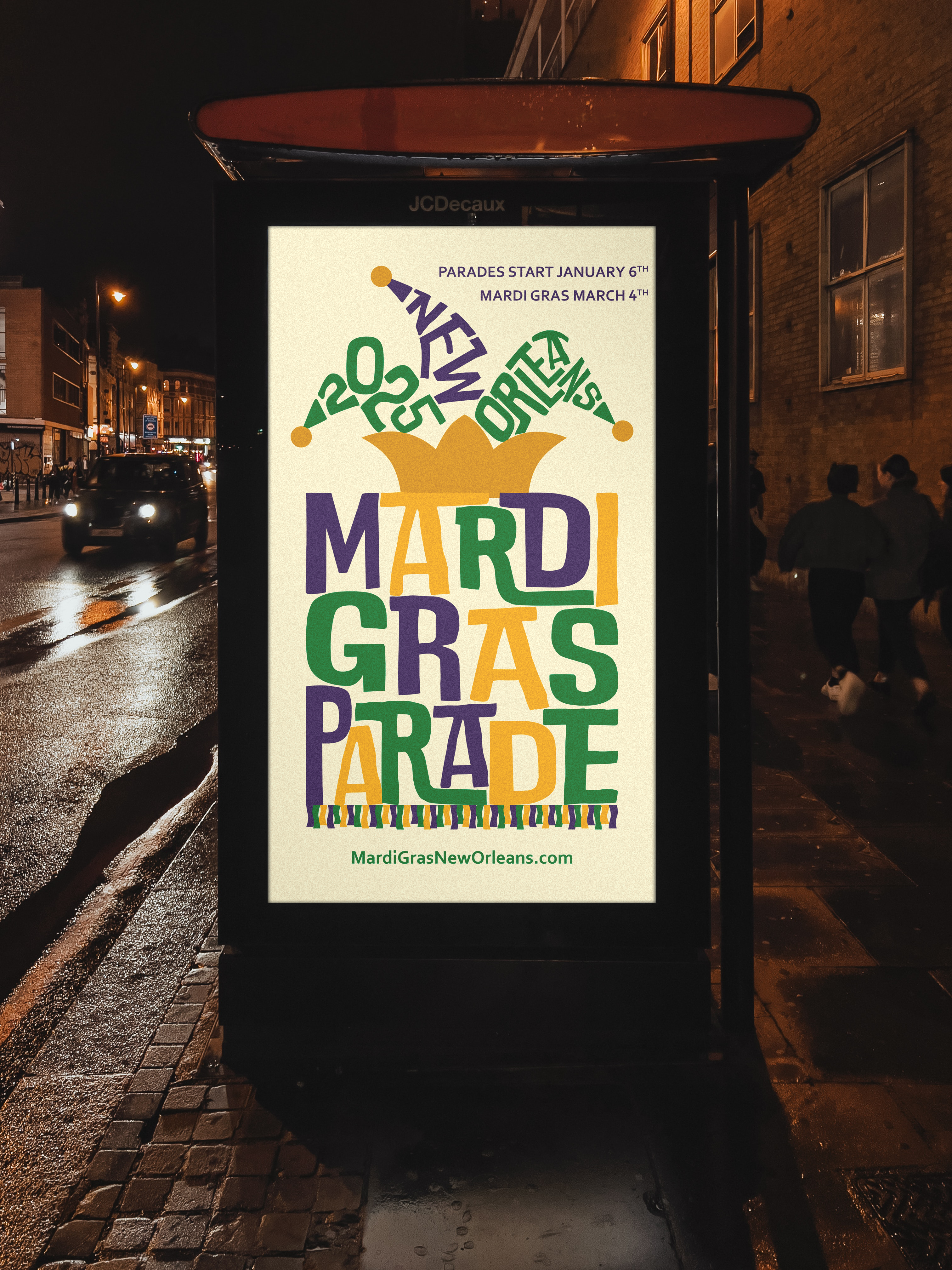 Let the good times roll! Mardi Gras is one of the largest celebrations in the South, drawing vibrant crowds to take part in the rich traditions along the Gulf Coast. While festivities span multiple cities, New Orleans, LA stands as the most iconic destination, hosting a month-long series of parades, performances, and cultural events throughout the Carnival season. For this project, the goal was to develop a branding system that captures the energy, rhythm, and heritage of Mardi Gras that is inspired by parade culture.